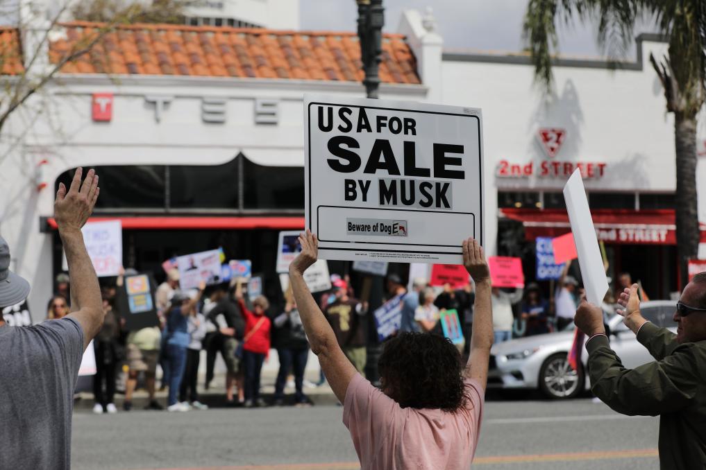 2025年3月29日,示威者聚集在美国加利福尼亚州帕萨迪纳的一家特斯拉门店外。新华社发(邱晨摄)