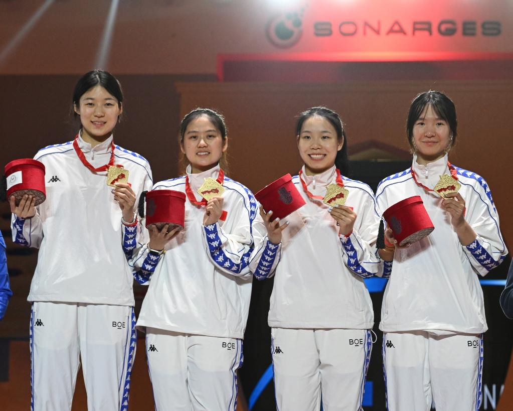 余思涵、杨静雯、唐君瑶、施悦馨(左至右)庆祝胜利。图片来源:国际剑联官网