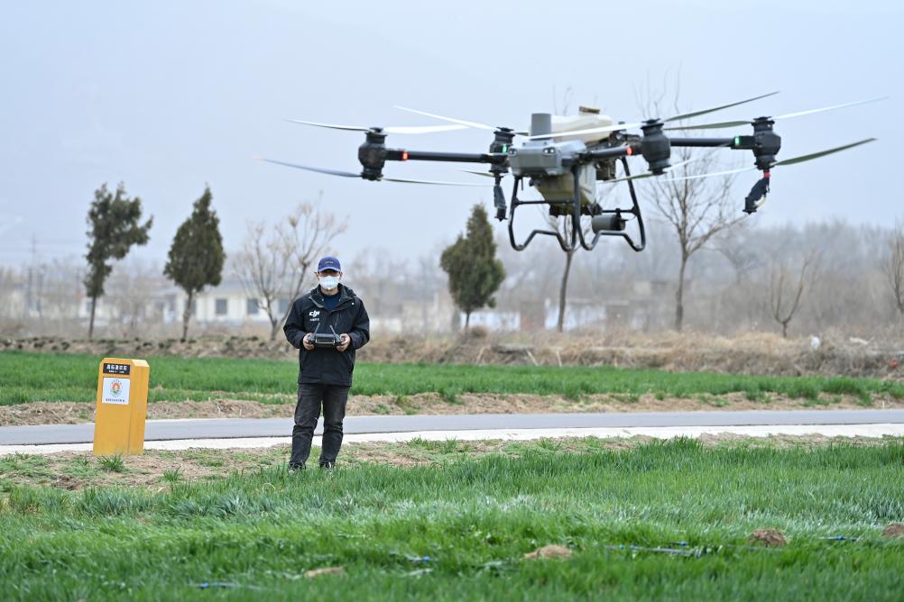 在山西省运城市盐湖区解州镇曲村,飞手操控无人机为麦田打药。新华社记者杨晨光 摄