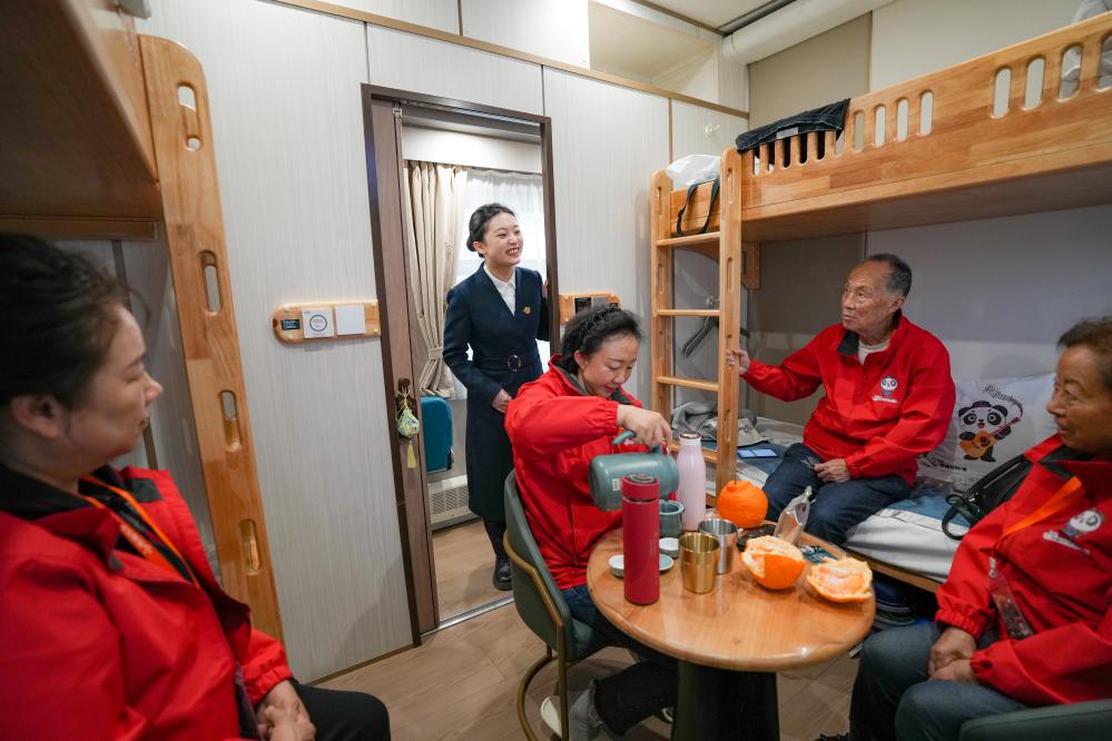 国铁成都局成铁商旅公司工作人员周子豪告诉记者,国铁成都局开行的“熊猫专列”已经进行了适老化改造,每个包厢和淋浴室都增设了护栏、扶手、SOS紧急呼叫器等。列车上配备了“熊猫管家”,全程陪同银发旅客出行服务。