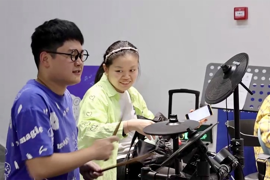 普通孩子在与他们的朝夕相处中,也悄然发生着改变。“他们有不懂的不会自己提出来。因为沟通上存在一些障碍,所以我们就要有耐心地跟他说,哪里可以慢一点,哪里可以快一点。”乐队的初中生成员小艺和小凯说,在协作中更多地学会了接纳、包容彼此。