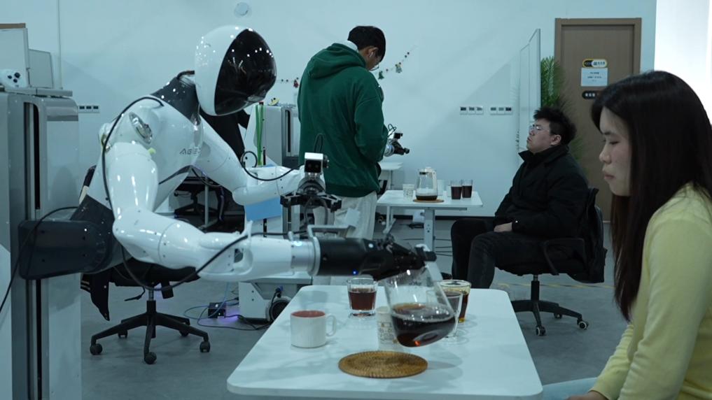 一个4000平方米的数据采集中心,就是机器人们的训练场。今天,它们正在模拟居家、餐厅、超市、小卖部等日常生活场景,学习各种技能:清理衣物、端茶倒水,整理超市货架,还能协作铺桌布……这个过程并不简单,比如说,在我们人类眼中极其简单的倒水这件事,机器人可能需要学习数百次:要会往杯子A里面倒水,也要会往杯子B里倒水,当杯子被临时挪开,或者光线变暗了,机器人都要做到应对自如,不会把水洒到外面。