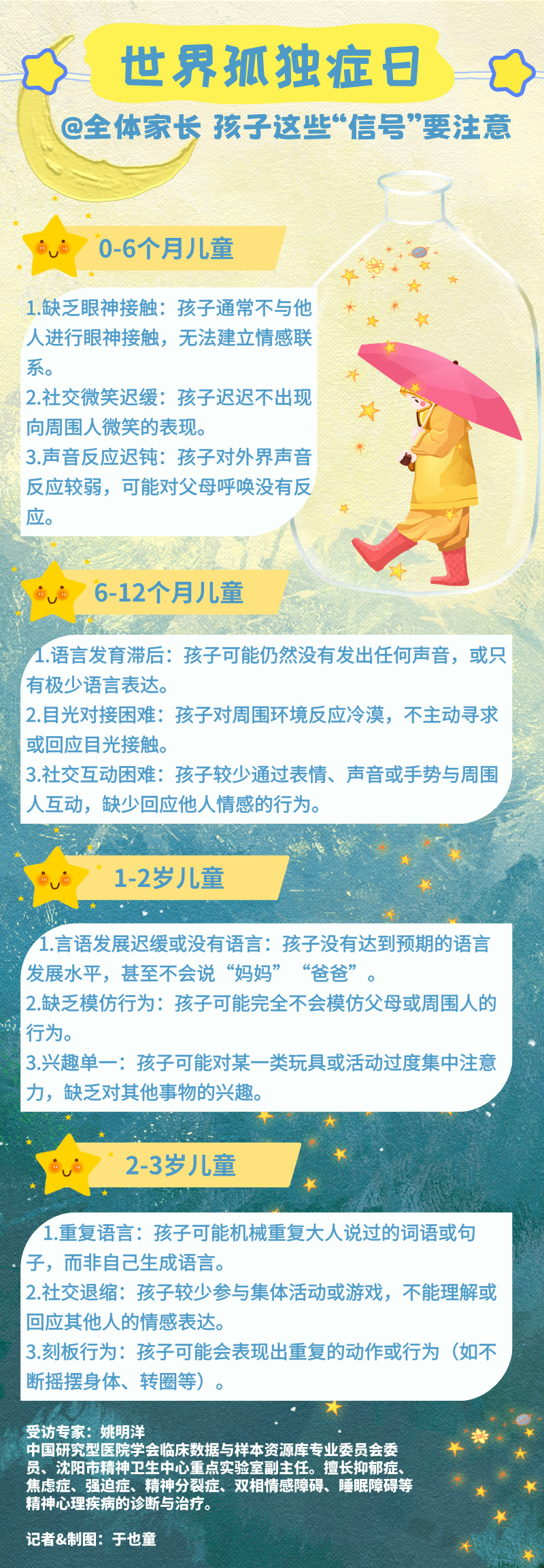 新华社沈阳4月2日电(记者于也童)4月2日是世界孤独症日。孤独症是一种慢性神经发育障碍疾病,在医学上的全称是“孤独症谱系障碍”,孤独症儿童也被称为“星星的孩子”。研究表明,早期干预可显著改善孤独症儿童的社会功能和认知发展。孤独症的早期信号通常在孩子的生命早期就有所表现,根据年龄段表现有所不同。及时捕捉不同年龄段孩子的这些“信号”,帮助孤独症儿童更好成长。