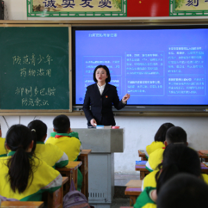 图为冷远玲老师正在给学生开展禁毒主题班会。