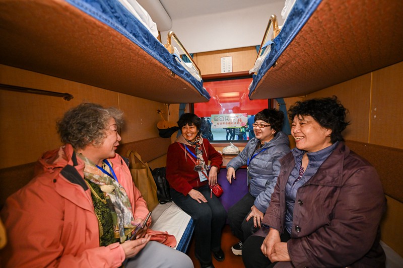 3月15日,银发族游客在“京铁乐游”号银发旅游列车上交谈。新华社记者 孙凡越 摄