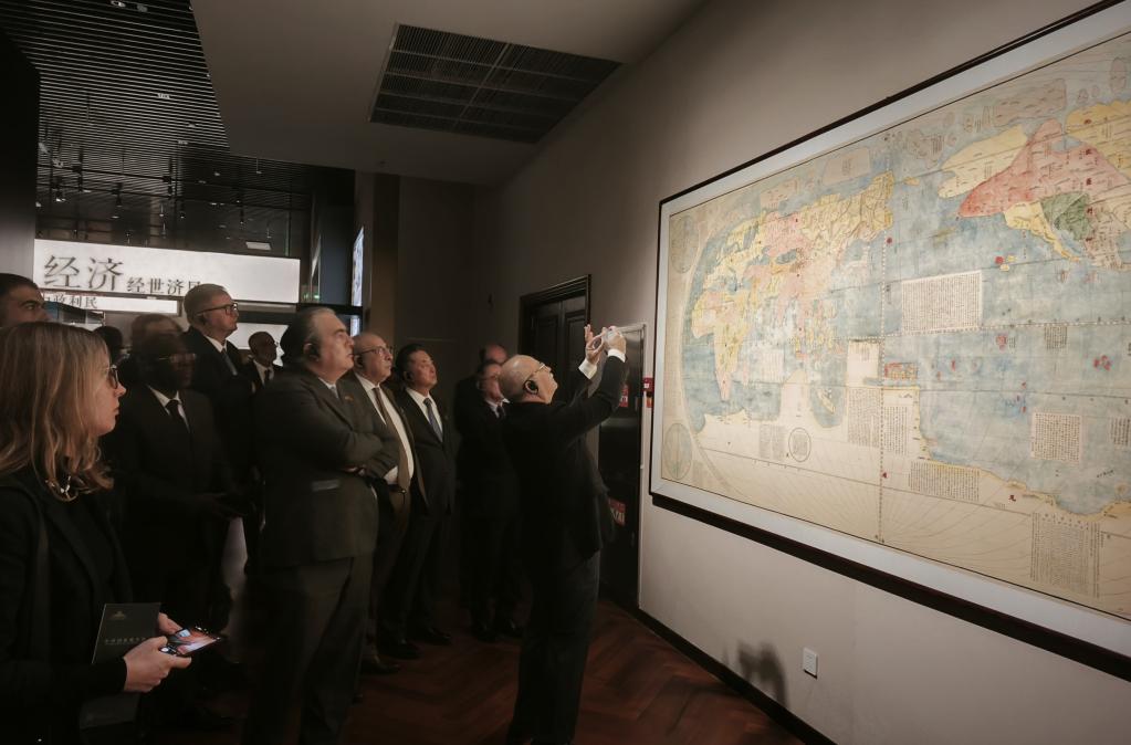 在明朝万历年间绘制的世界地图《坤舆万国全图》前,驻华外交官们纷纷拿起手机拍照。“我的国家在这里!”希腊驻华大使卡尔佩里斯说,“地图上标注了一些位于古丝绸之路上的希腊城市。希腊和中国在古代就进行了许多文明交流,这样的交流在当下更加有必要。”