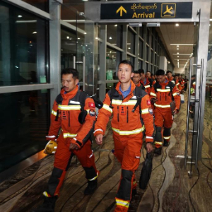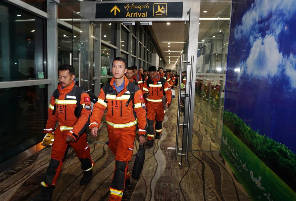 当地时间3月29日晚,中国香港特别行政区救援队抵达缅甸仰光国际机场。