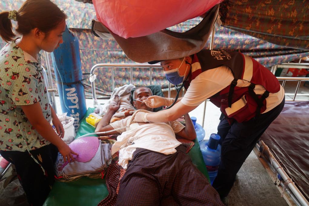 3月31日,在缅甸首都内比都的千床医院,中国云南救援医疗队的专家评估地震伤员病情。