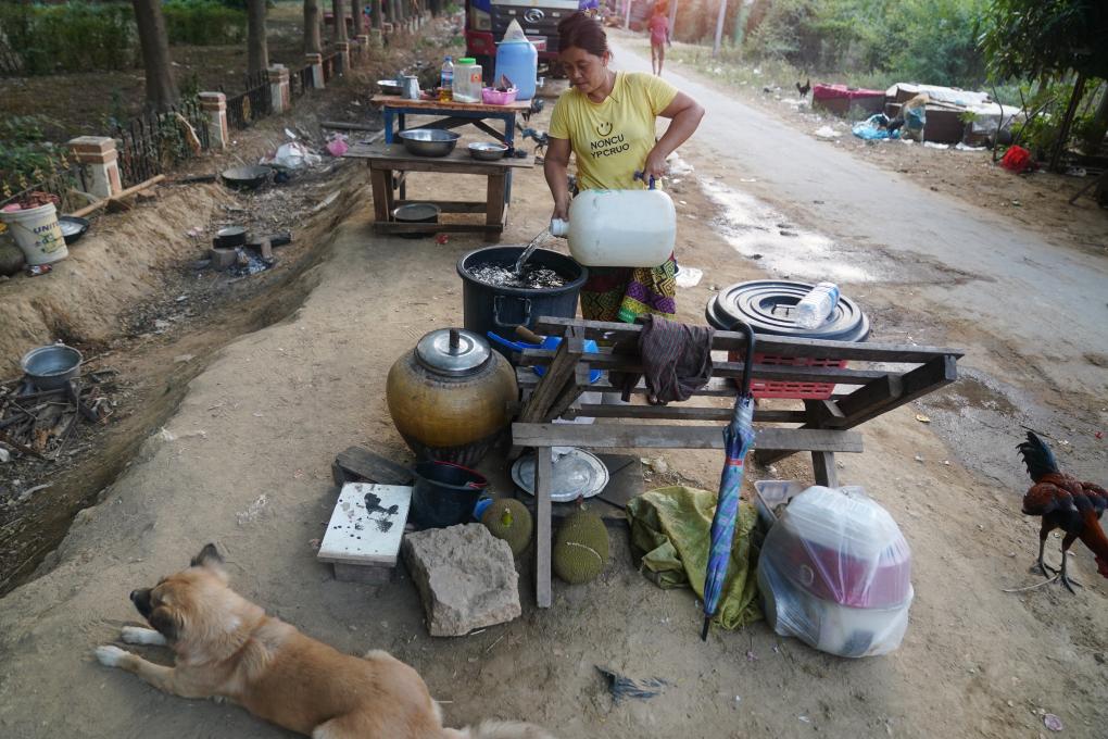 3月31日,在缅甸首都内比都,一名女子在土路边做晚饭。