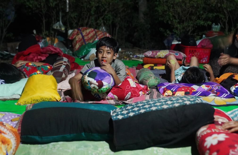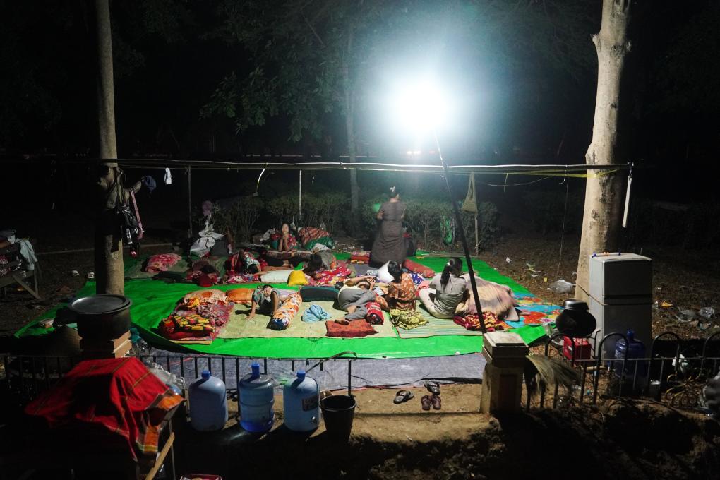 3月31日,在缅甸首都内比都,地震受灾民众在土路边的树林中过夜。