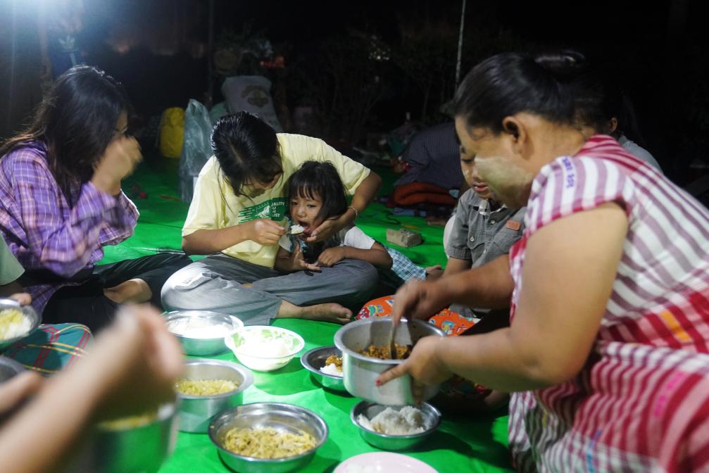 3月31日,在缅甸首都内比都,地震受灾民众在土路边的树林中吃饭。