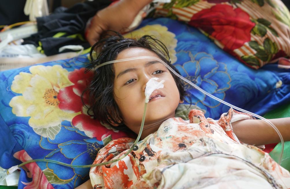 3月31日,在缅甸首都内比都的千床医院,2岁的泽內阳武在临时病床上接受治疗。