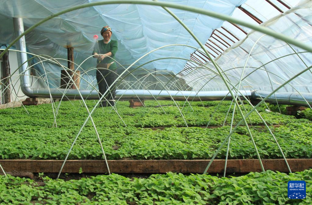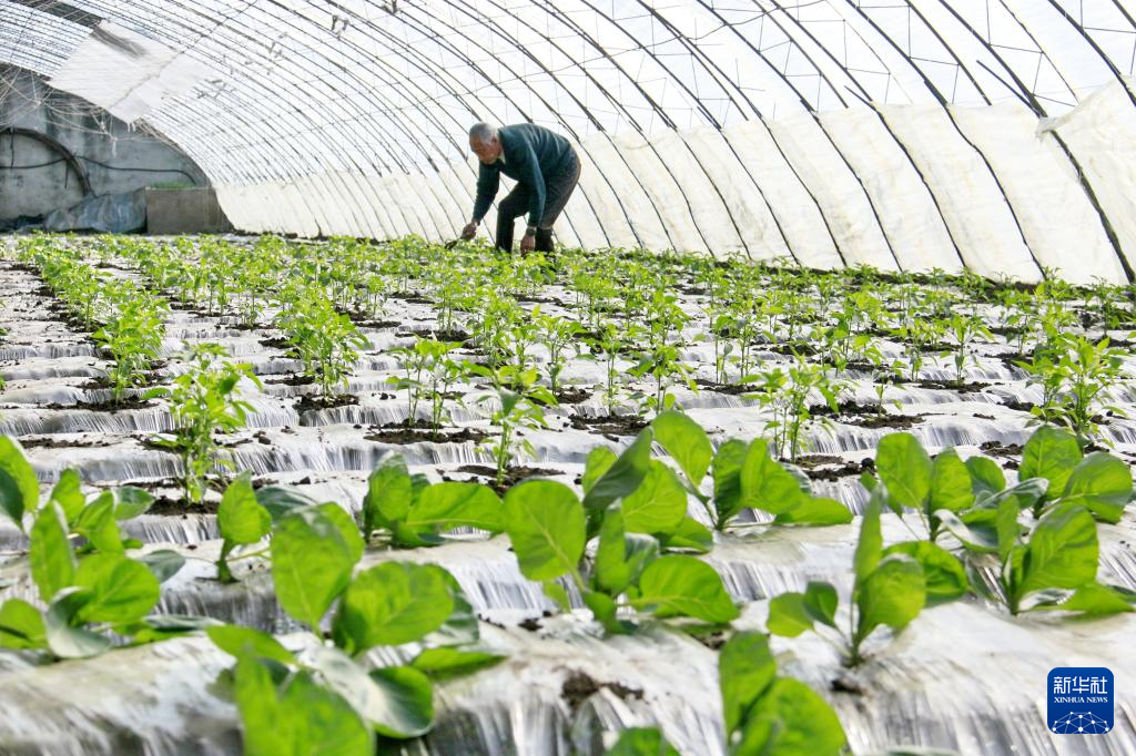 4月4日,种植户在北大荒集团黑龙江格球山农场有限公司蔬菜基地管理蔬菜。