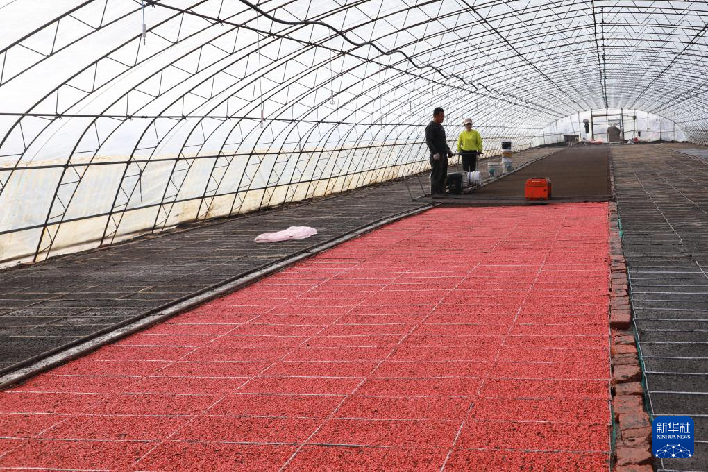 4月4日,种植户在北大荒集团黑龙江七星农场有限公司第一管理区水稻育秧大棚内播种。
