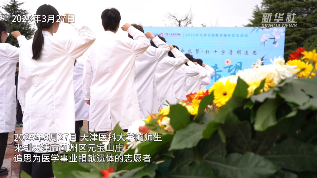 清明前夕,天津医科大学的师生来到天津市蓟州区元宝山庄追思为医学事业捐献遗体的志愿者。一束束菊花轻触“奉献碑”的瞬间,千余名遗体捐献者名字在师生的凝望中闪耀。