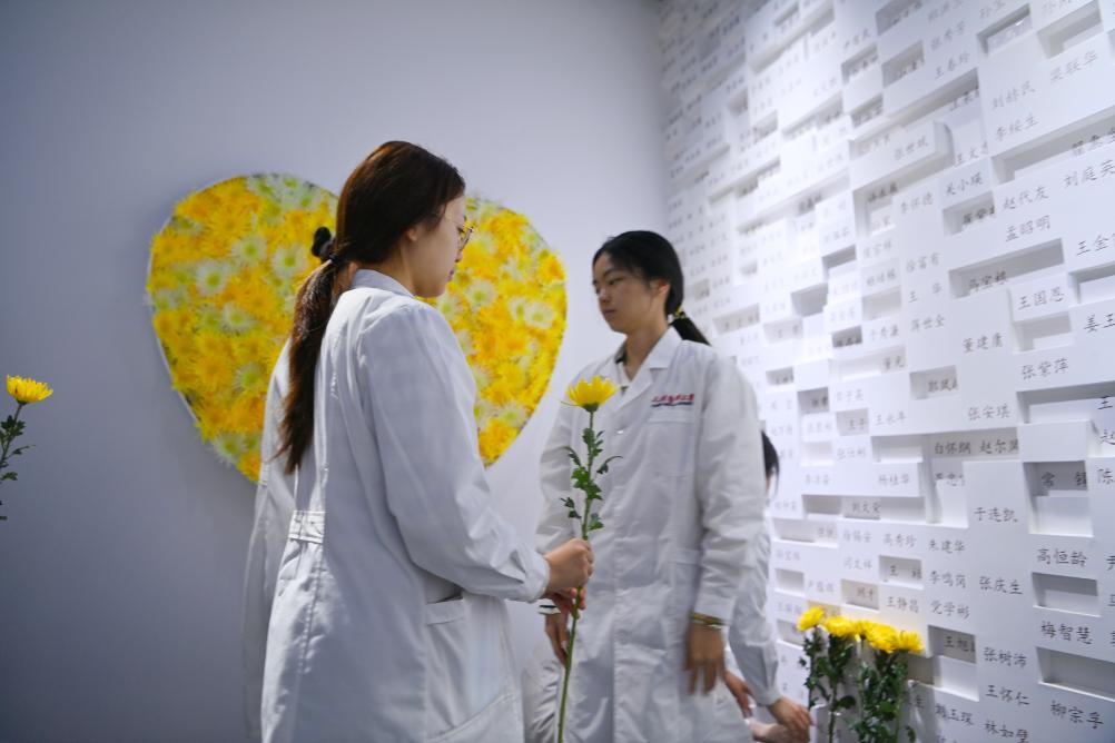4月2日,学生在天津医科大学生命意义展厅“大体老师”纪念墙前献花。新华社记者 李然 摄