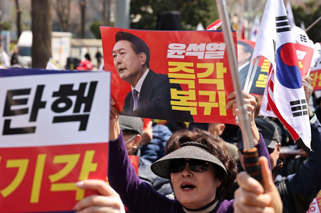 4月3日,在韩国首尔,尹锡悦支持者在韩国宪法法院附近示威要求驳回弹劾。牌子上写的是,欺诈性弹劾,应当被驳回。尹锡悦立刻回归。新华社发(全休相摄)