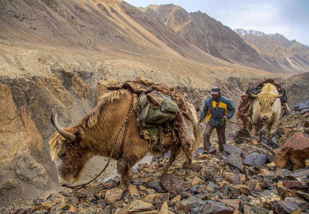 2013年9月28日,拉齐尼牵着牦牛在陡峭的边境线上巡逻。新华社发(王烈 摄)