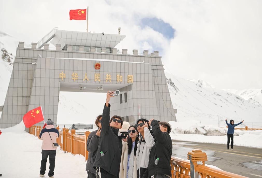 游客在新疆塔县红其拉甫国门景区拍照(2025年3月30日摄)。新华社记者 胡虎虎 摄