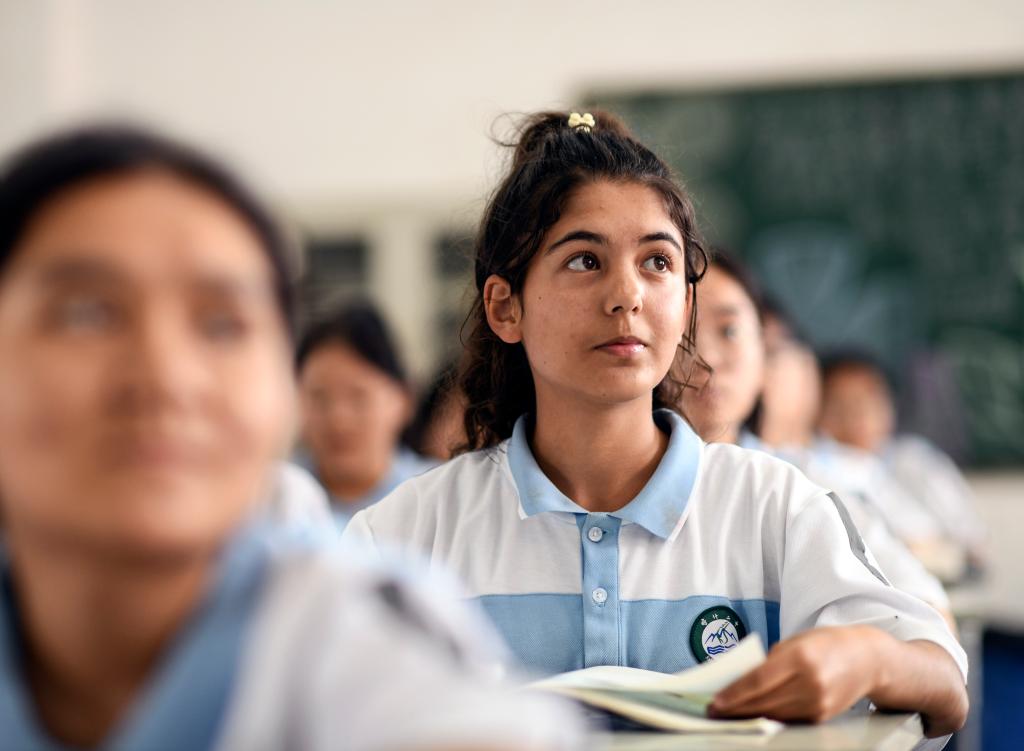 2023年9月7日,在新疆喀什第二中学,拉齐尼的女儿都尔汗·拉齐尼在课堂上认真听讲。新华社记者 王菲 摄
