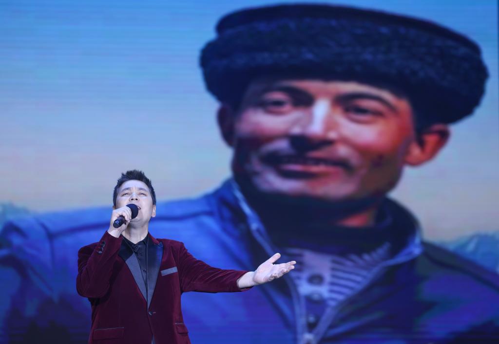 在新疆塔县的一次文旅活动上,歌手塔斯肯演唱歌曲《雄鹰飞过帕米尔》,背景屏幕为“时代楷模”拉齐尼照片(2024年3月20日摄)。此歌再现了拉齐尼的爱国护边事迹和英雄形象,在当地传唱度较高。新华社记者 胡虎虎 摄