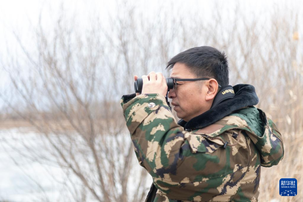 4月1日,黑龙江兴凯湖国家级自然保护区管理局科研宣教中心主任刘化金在保护区内观测候鸟。新华社记者 谢剑飞 摄