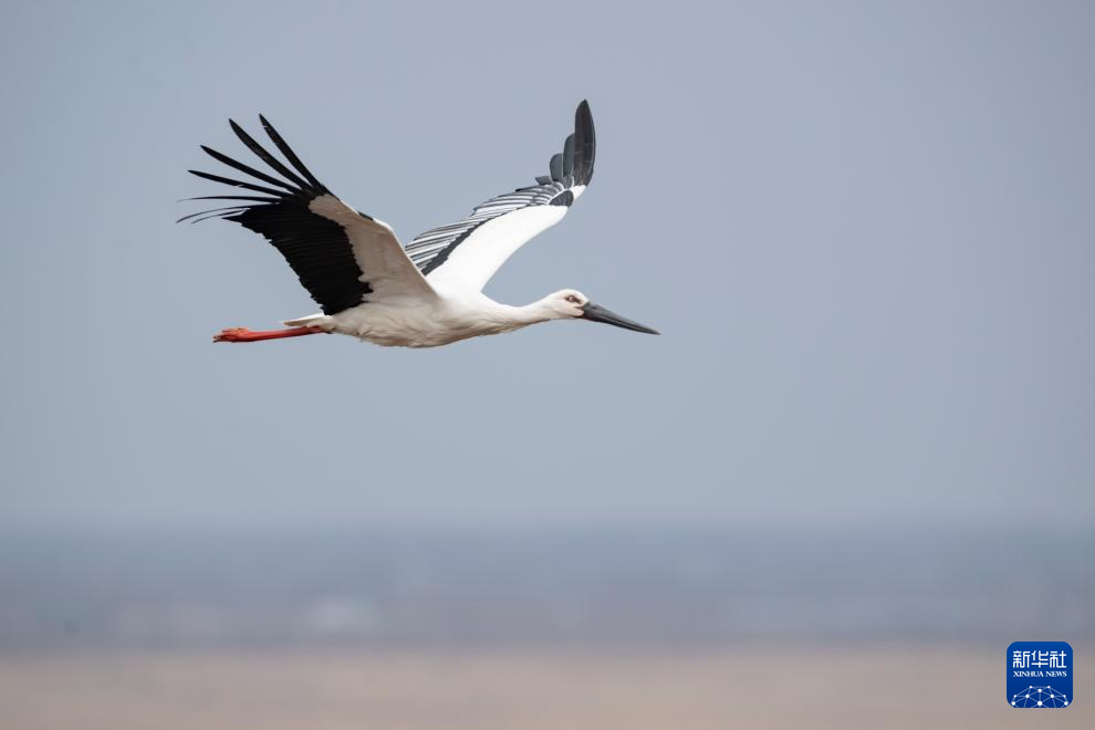 4月1日,一只东方白鹳在位于黑龙江省鸡西市的兴凯湖国家级自然保护区上空飞翔。新华社记者 谢剑飞 摄