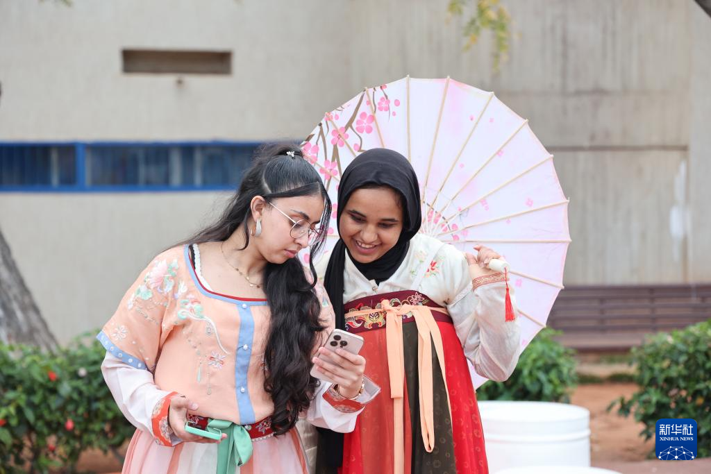 4月3日,在摩洛哥首都拉巴特的国立拉巴特高等矿业学校,两名女孩在“世界文化周”活动的中国展台体验汉服。新华社记者 霍晶 摄
