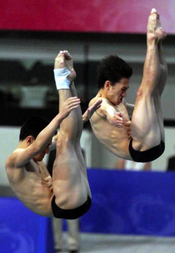 2000年9月28日,熊倪(左)、肖海亮夺得悉尼奥运会男子3米板双人跳水金牌。新华社记者 兰红光 摄(数码传真照片)