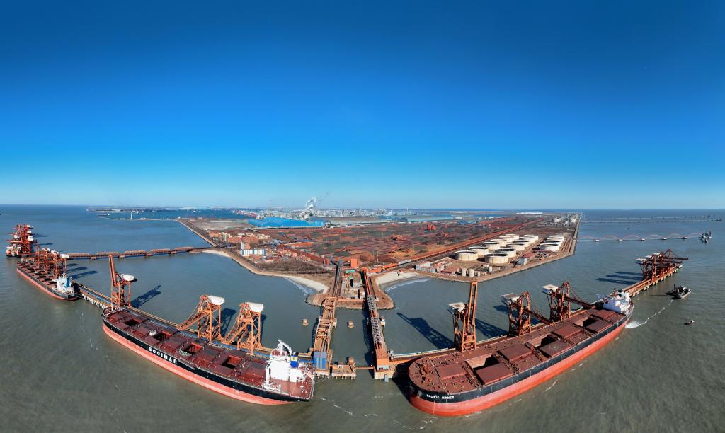 1月9日,轮船靠泊在唐山港曹妃甸港区矿石码头卸载(无人机全景照片)。新华社记者 杨世尧 摄