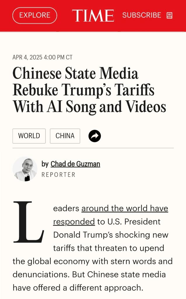 近日,美国《时代》周刊网站刊登一篇题为《中国国家媒体用AI歌曲和视频抨击特朗普关税政策》的文章,关注到了新华社发布的一部AI科幻短片《塔·里·夫》。