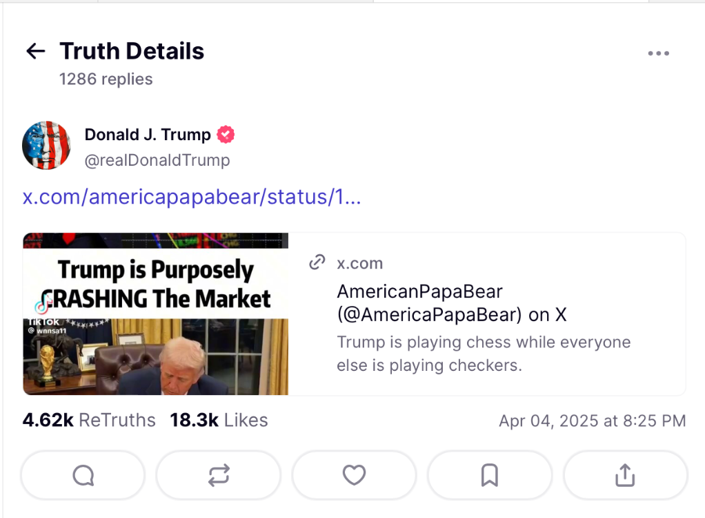 美国总统特朗普近日在社交媒体上转发其支持者发布的一段视频,视频开头表示股市崩盘是“故意”的。此后,特朗普又发文喊话让美国人民“挺住”。