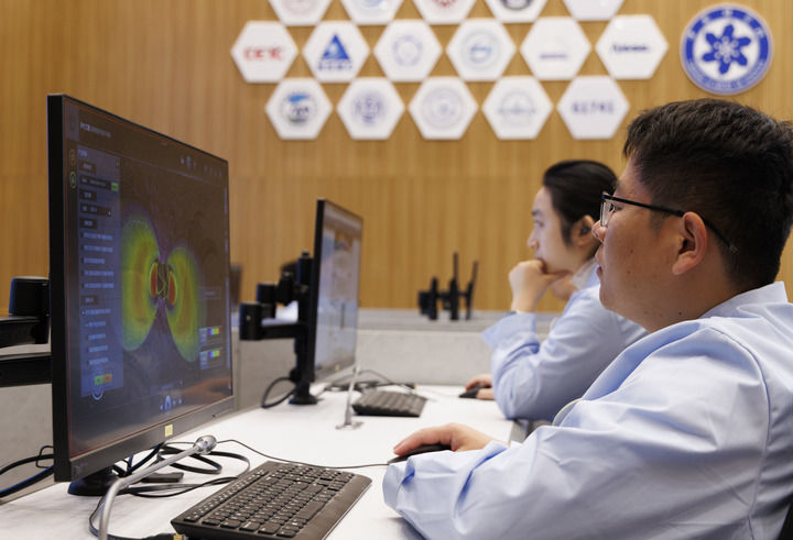 在位于北京怀柔的子午工程综合信息与运控中心,科研人员在监测运行情况(2025年3月20日摄)。新华社记者 金立旺 摄