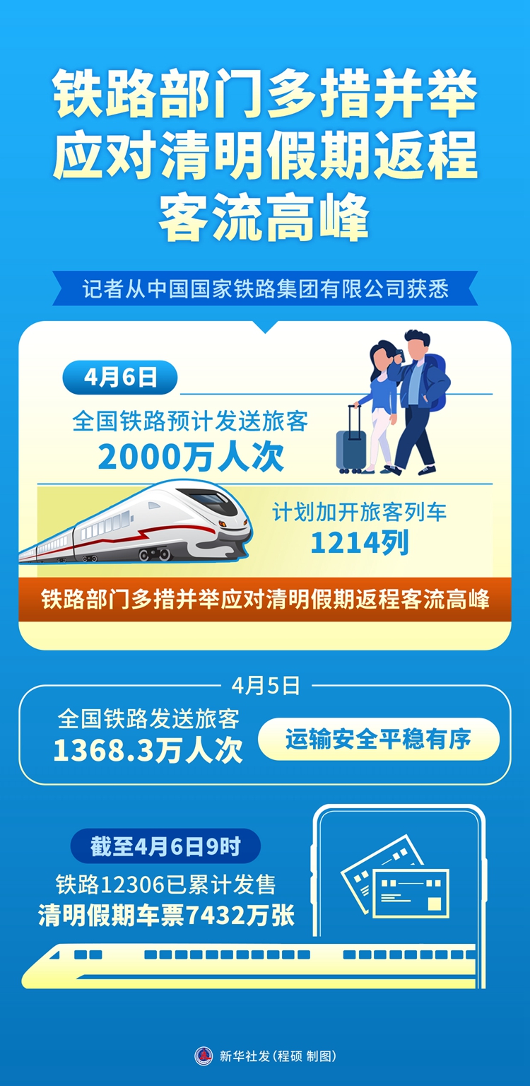 新华社北京4月6日电(记者樊曦)记者从中国国家铁路集团有限公司获悉,4月6日,全国铁路预计发送旅客2000万人次,计划加开旅客列车1214列。铁路部门多措并举应对清明假期返程客流高峰。