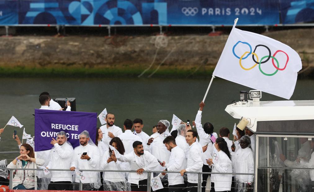 2024年7月26日,难民体育代表团在巴黎奥运会开幕式上。新华社记者 李京 摄