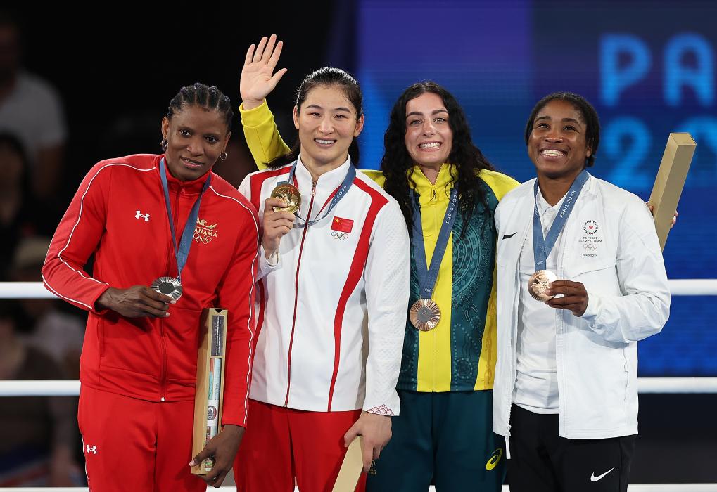 2024年8月10日,巴黎奥运会拳击项目女子75公斤级冠军中国选手李倩(左二)、亚军巴拿马选手拜伦(左一)、季军难民体育代表团选手恩甘巴(右一)和澳大利亚选手帕克在颁奖仪式上合影。新华社记者 任鹏飞 摄