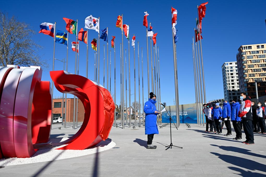 2022年2月1日上午,国际奥委会主席巴赫(左一)为北京冬奥村里的休战壁画揭幕。新华社/POOL/王钊