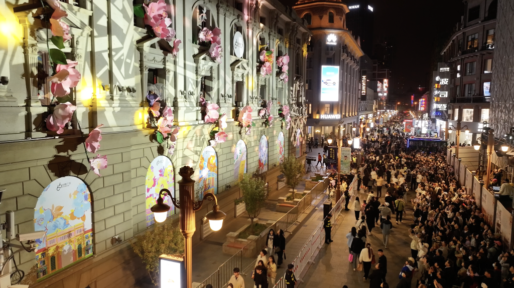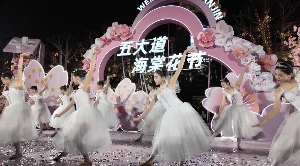 一树海棠,满城“绽放”。在天津金街,特色市集、购物中心、沿街店铺纷纷推出海棠主题特色产品及促销活动,春日消费持续升温。