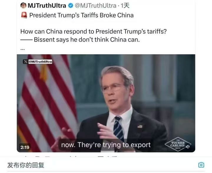贝森特本月4日接受《塔克·卡尔森秀》栏目采访,为美国政府关税政策进行辩护。贝森特在节目中声称,“中国的商业模式和经济是现代历史上最不平衡的,中国出口占其国内生产总值(GDP)比重之高前所未见”。