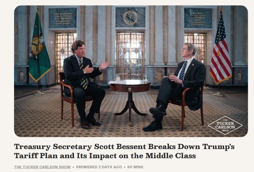 美国财政部长斯科特·贝森特接受美国知名新闻主播塔克·卡尔森采访。