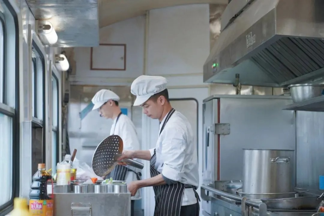 餐车后厨灶火燃烧,食材翻飞入锅,厨师们煎炒炖煮,飘出阵阵诱人的香气。“我们做菜遵循‘营养均衡、食物多样、严控三低(低盐、低糖、低脂)’的原则,提供炒菜、杂粮、面食、米粉等多样化食谱,让大家吃得满意、吃得健康。”餐车长覃美霜介绍。
