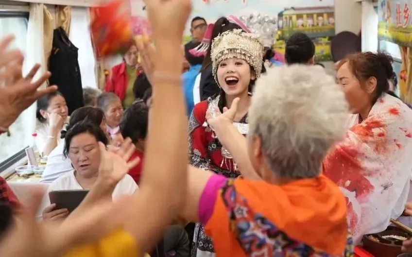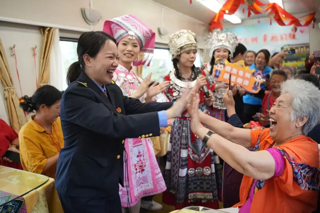 4月3日上午,列车化为“流动的舞台”。乘务员身着民族服饰翩然起舞,旅客携二胡、口琴、葫芦丝等乐器轮番上阵。簸箕宴上,瑶族油茶、五色糯米饭等特色“桂味”让人回味无穷……大家纷纷掏出手机,定格旅途记忆。