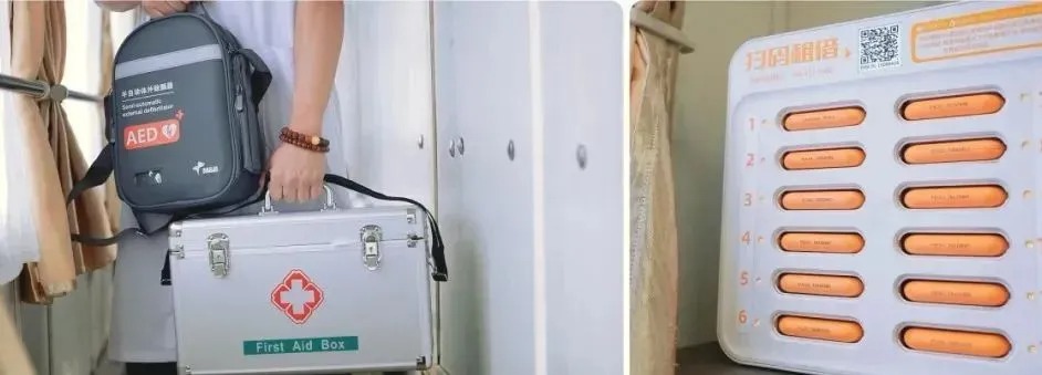 车厢内增设充电器、插座、充电宝租借区,卫生间增配折叠式坐便椅、紧急呼叫装置。此外,列车上还备有AED除颤仪、电子血压计、体温计等医疗设备,以及常用药品,精准护航老年旅客身体健康。
