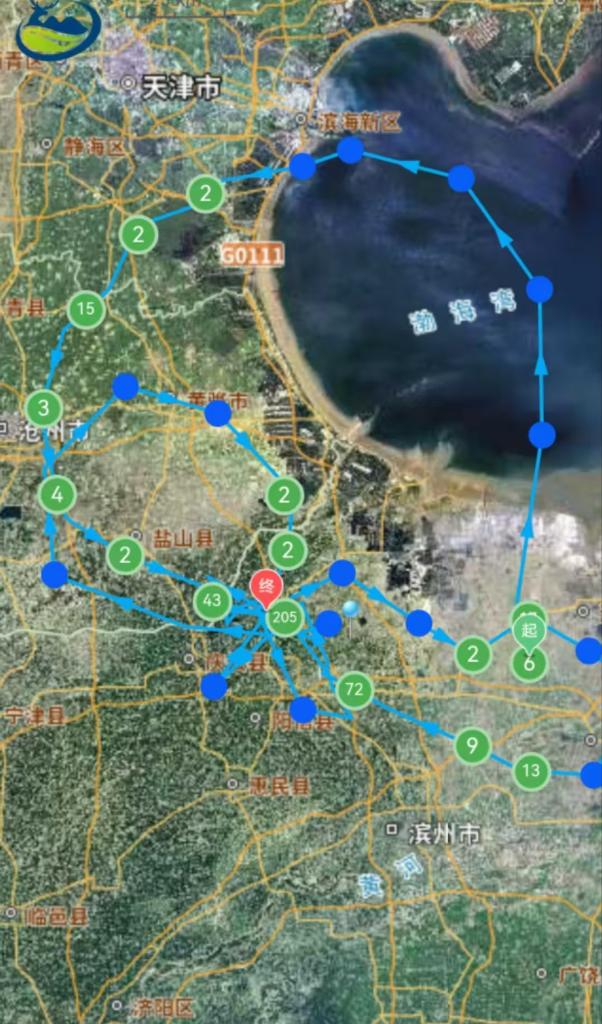 3月19日清晨5时40分,162号朱鹮由位于中国东部的山东东营利津盐窝镇振翅启程,1小时后从陆地进入渤海,之后4小时持续跨海飞行抵达天津港区,再历经5次起降抵达河北沧州。科研团队通过北斗卫星追踪发现,该个体在强气流中维持30-50公里时速,成功穿越渤海海域。渤海海峡的强气流与无落脚点的飞行环境,对翼展不足1.5米的朱鹮堪称生死考验。