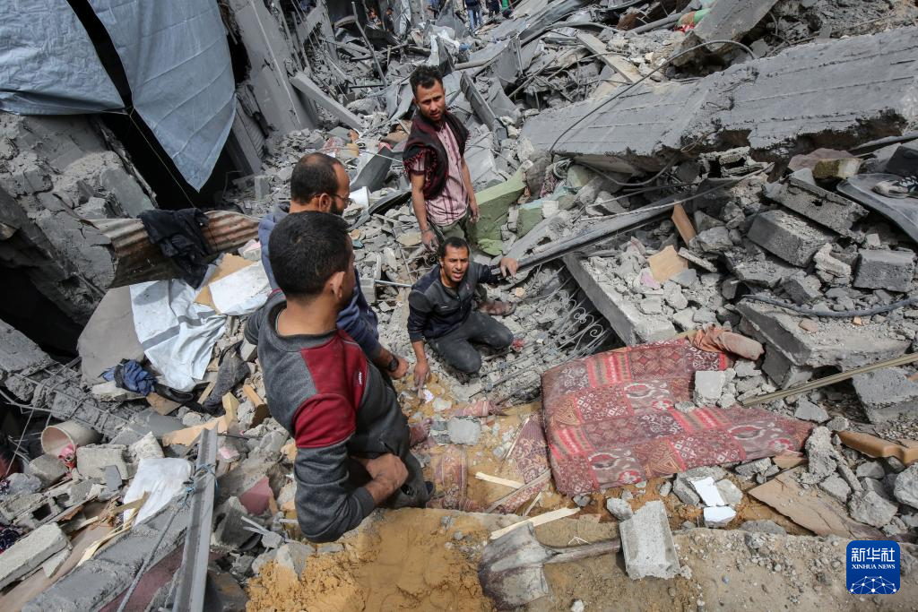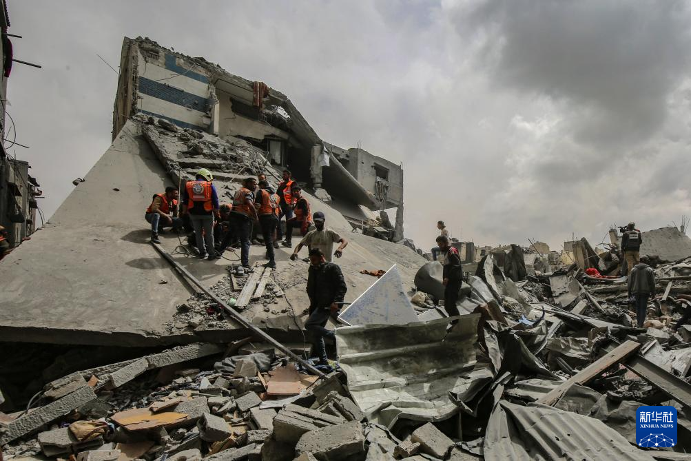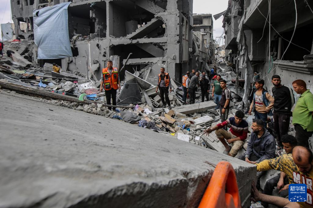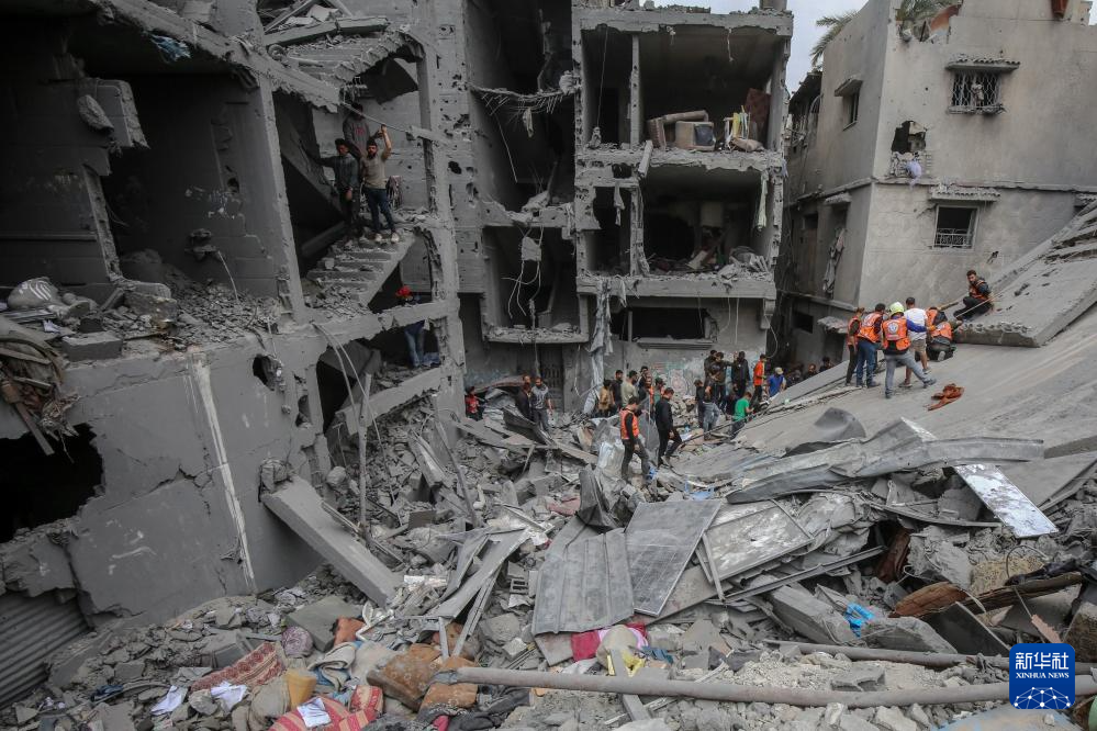 4月9日,人们在加沙城舒加艾耶社区搜寻以军轰炸幸存者。新华社发(里泽克·阿卜杜勒贾瓦德摄)