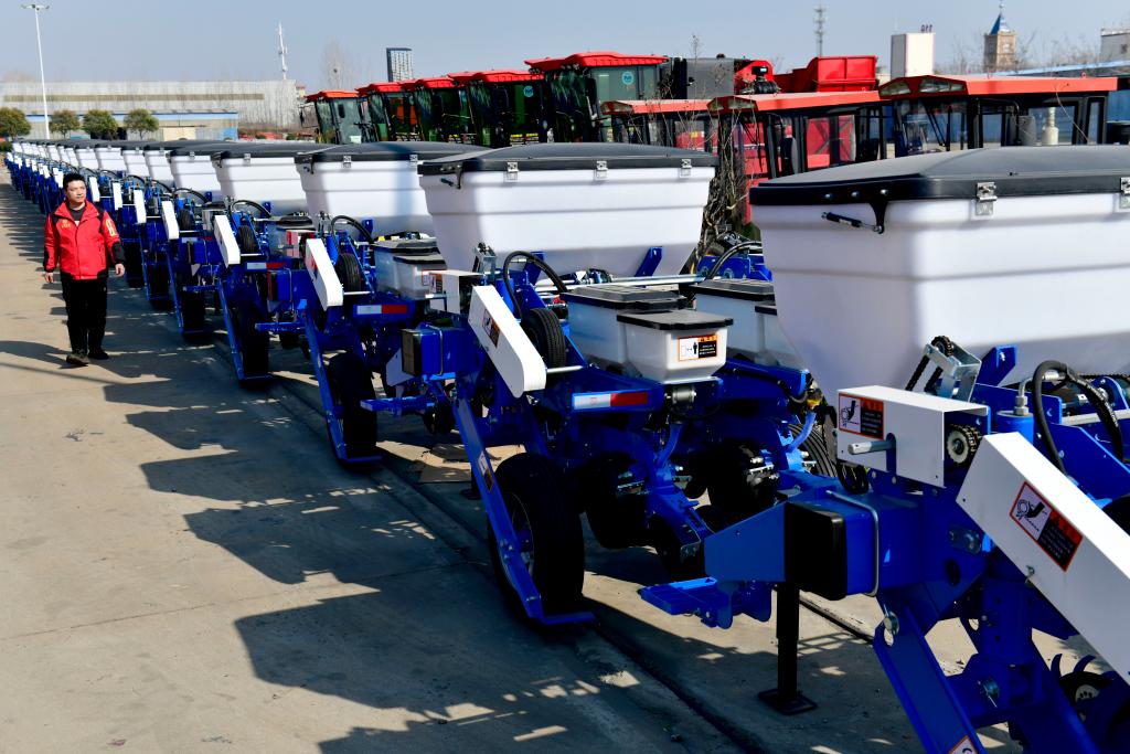 3月19日,在位于济宁市兖州区的山东国丰机械有限公司,工作人员在查看停放的播种机。新华社记者 郭绪雷 摄