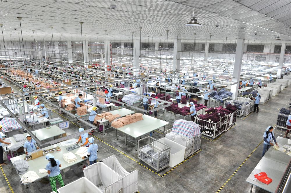 3月10日,在苏豪柬埔寨工厂生产车间里,工人们正赶制订单(苏豪控股集团供图)