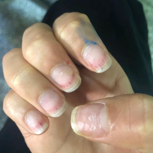 记者在多家美甲店体验时发现,有的美甲师去死皮、打磨指甲手法粗暴。在一家美甲店,美甲师一轮操作下来,记者的指甲仿佛“脱了一层皮”,有几处在修剪死皮后出血,还隐隐作痛。