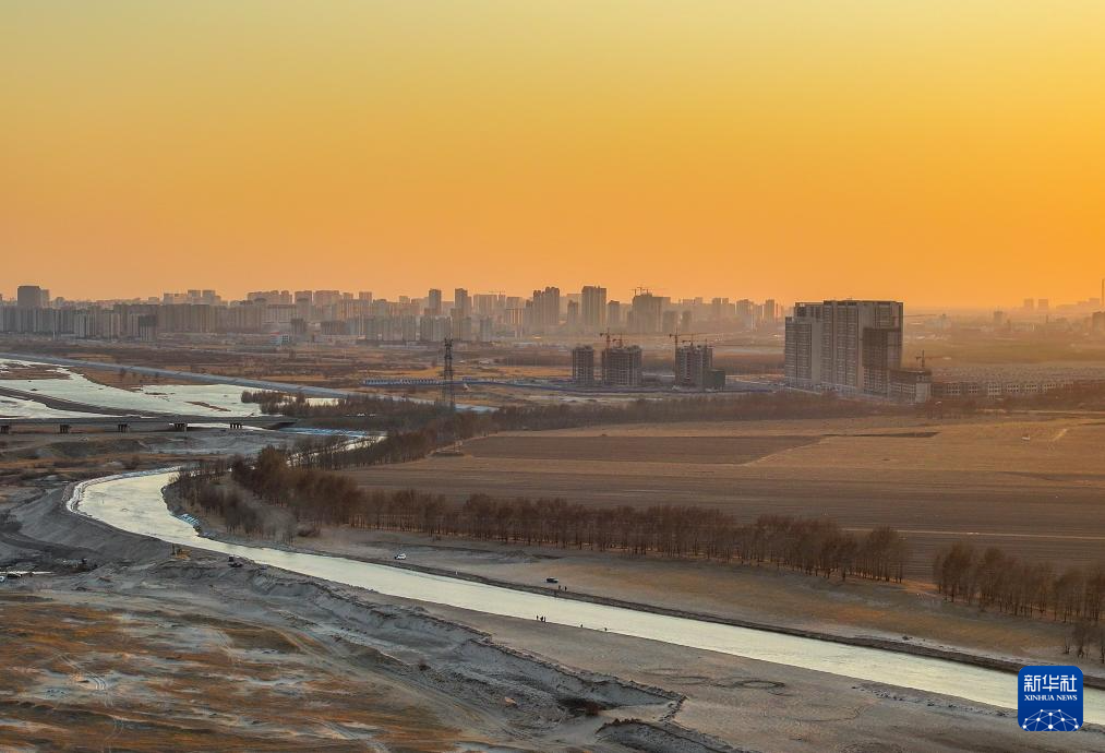 4月8日,西辽河水穿过通辽城区(无人机照片)。新华社记者 连振 摄