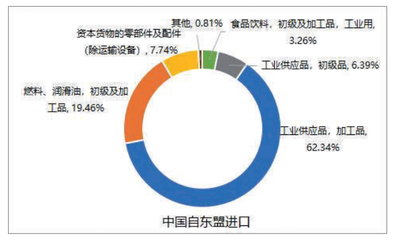 近年来,东盟国家凭借在轻工业、机电产品及配件等劳动密集型产业和能源原材料方面的比较优势,高效承接国际产业转移;中国则依托成熟的工业体系、强大的制造业基础、较高的技术水平,以及在纺织、电气和光学设备等制造业的产业优势,为东盟国家提供关键的中间产品和技术支持。在此过程中,双方逐渐形成“东盟向中国出口初级品-从中国进口机械设备(资本密集型)和中间品(技术密集型)-再将消费品(劳动密集型)出口给中国和第三国”的互利共赢的“区域循环”模式。